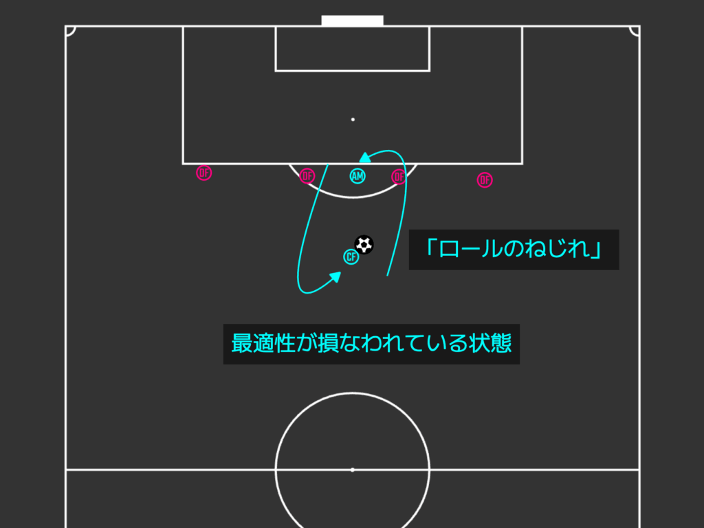 つまり「標準的な配置&フォーメーション=最適」であると言えますが、実際の試合の中ではさまざまな理由により、ポジションと役割が逆転しまうことがあり、それを「ロール(役割)のねじれ」と定義付けしています。