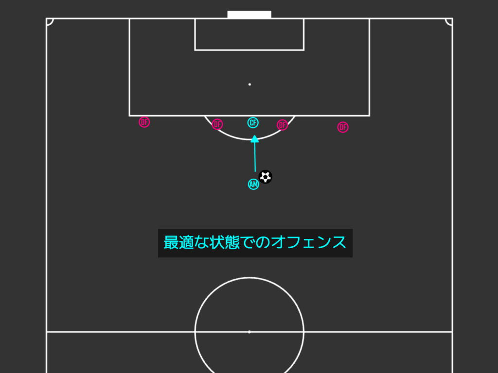 たとえば、次の図のようにゴール前におけるポジショニングは「CF/受け手-AM/ボールホルダー」が標準的な最適である状態であります。