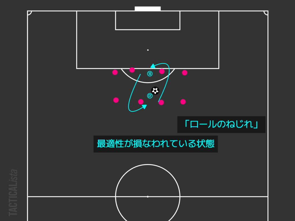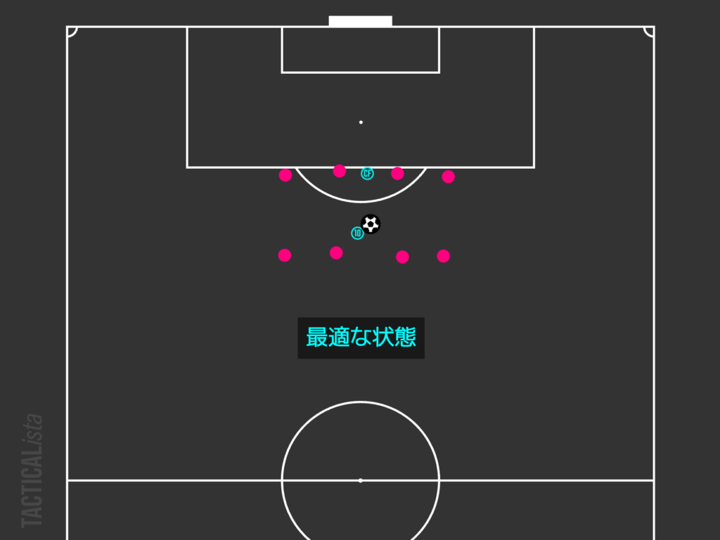 ところがCFがバイタルエリアでボールを受けてしまうと[10番=ボールホルダー + CF=オフ]という本来再現されるべき関係性を成立することができなくなってしまいます。