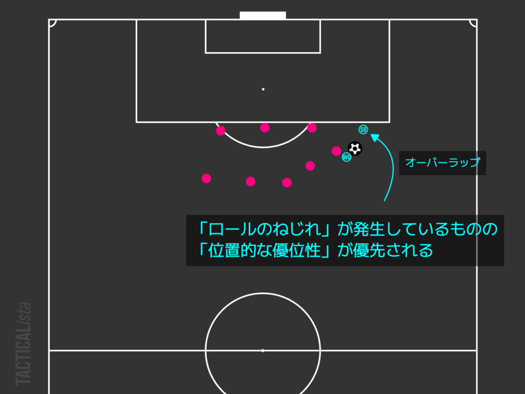 例えば、「SBのオーバーラップ」なんかもその一つです。SBは基本的にはMFやFWの選手に比べて、一部の例外的な選手を除きオフェンスのスキルは劣ることが一般的です。なので、SBがWGを追い越し、攻撃参加する時にもロールのねじれが発生します。