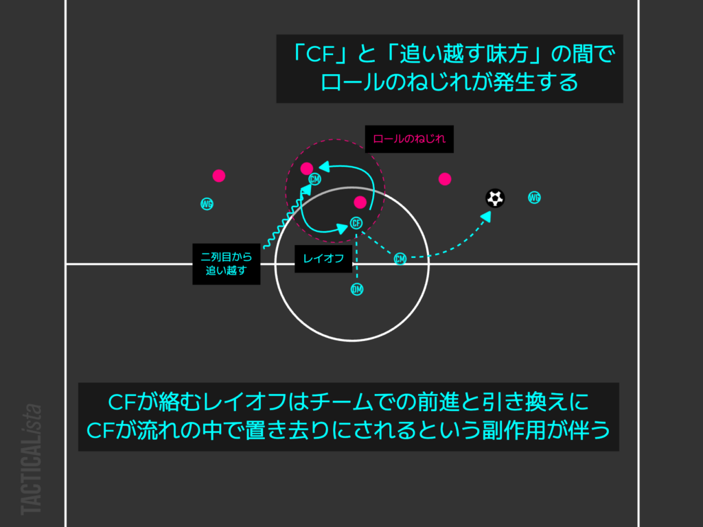 例えば、CFがポストプレーやレイオフなどでパスを受けて、2列目の味方が追い越していくと、チームとしてボールを前進できるという点ではメリットがありますが、得点力の高いCFが置き去りにされ、ゴール前で待つことができず、2列目の選手がゴールに向かって最前線に位置することになり、ここでもロールのねじれが発生することになります。