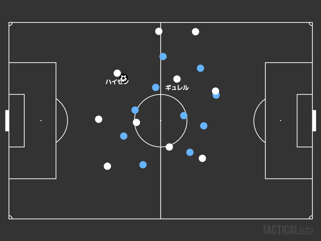 下の場面はGKからハイセンがボールを受けた直後の場面です。