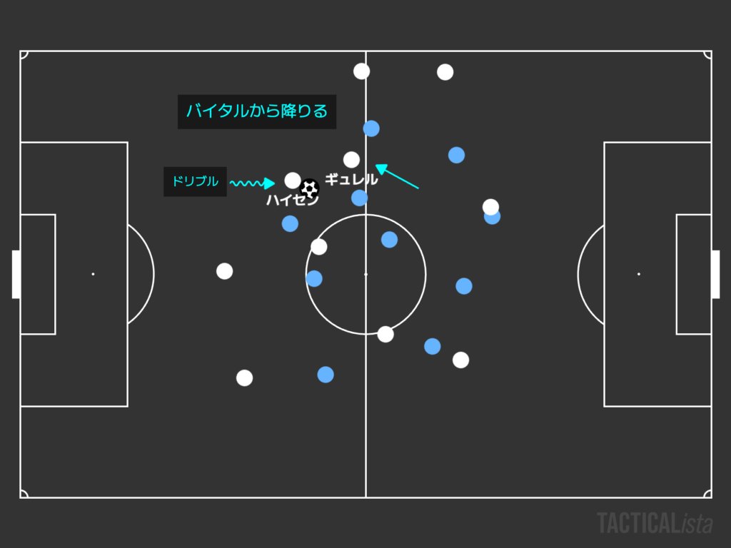 このような状況が整って安全なハイセンのライン越えのドリブルまたはギュレルがパスを受ける、という選択肢を持つことができます。