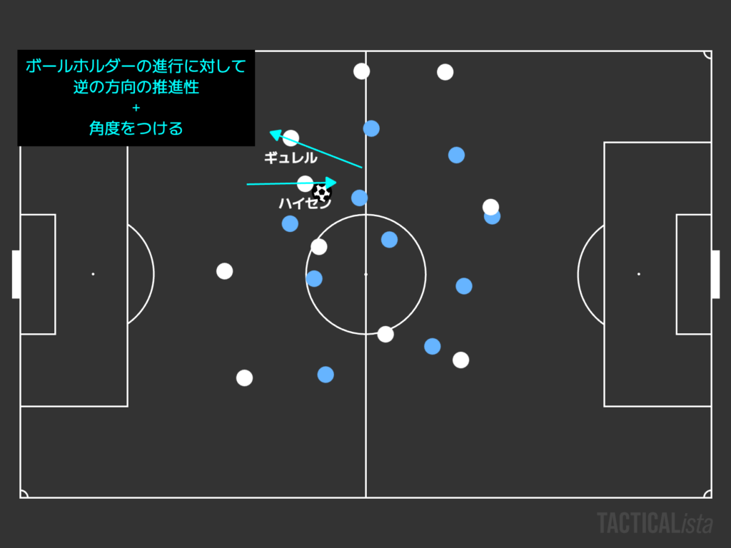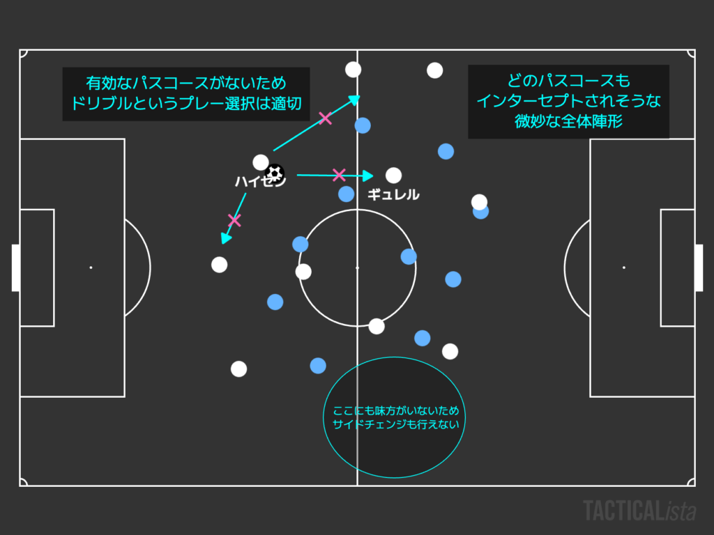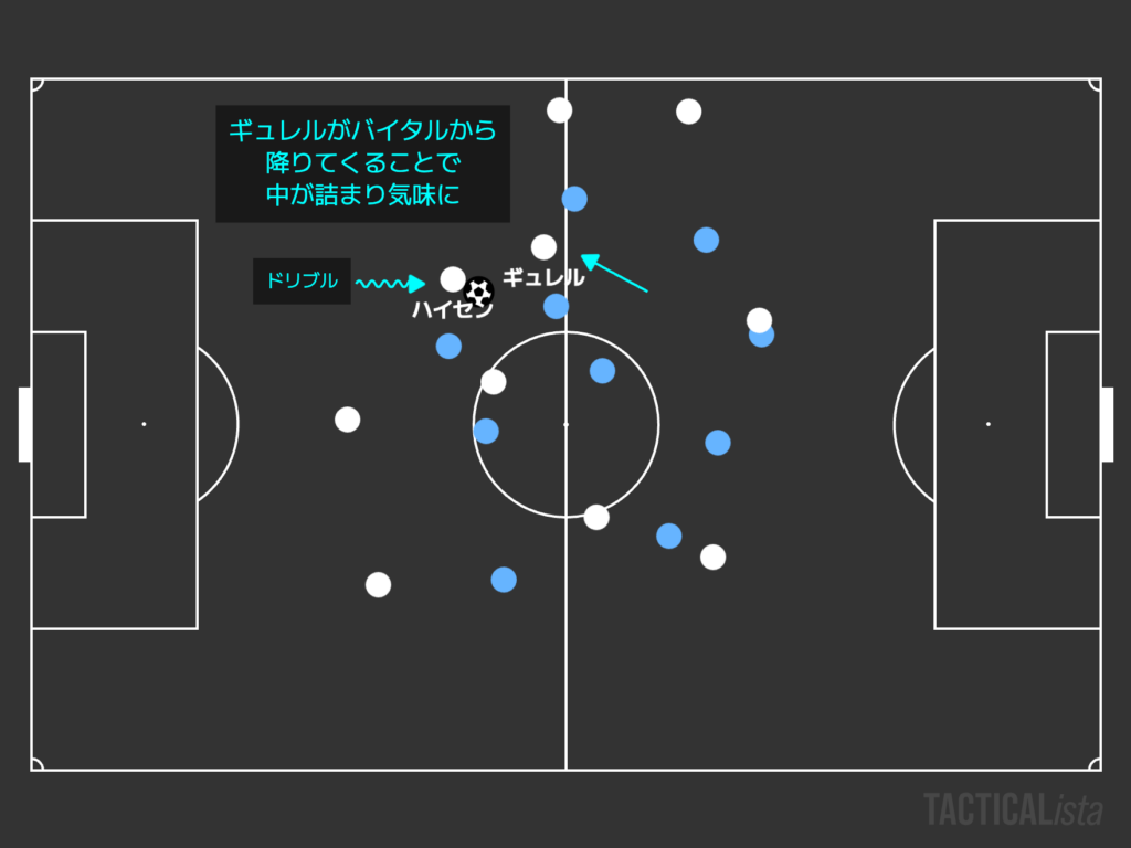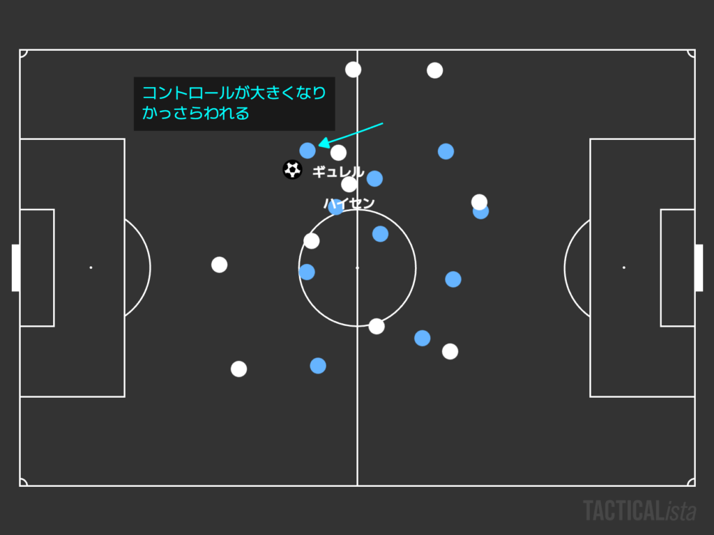 しかし前方に位置するギュレルが効果的なポジショニングをとることができず、ハイセンと被り気味になってしまっているため、窮屈なパスにもつながってしまいました。